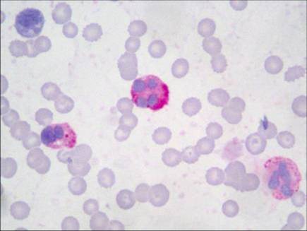 本試劑盒適用于骨髓細胞涂片及血液細胞涂片作染色檢查,原始粒細胞呈陰性,早幼粒及以后各階段細胞隨細胞的成熟,陽(yáng)性反應逐漸增強。嗜酸性和嗜堿性粒細胞亦為陽(yáng)性。單核細胞為弱陽(yáng)性反應,常為細小或彌散的陽(yáng)性顆粒。淋巴細胞呈陰性反應,少數為弱